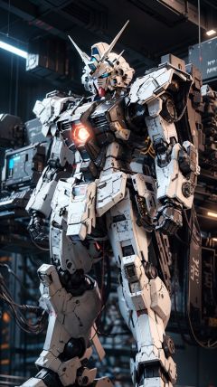 Gundam,solo,looking_at_viewer,blue_eyes,standing,no_humans,glowing,robot,mecha,glowing_eyes,clenched_hands,science_fiction,straight-on,v-fin,mobile_suit,cinematic lighting,strong contrast,high level of detail,Best quality,masterpiece,White background,<lora:Gundam_Mecha:0.7>,