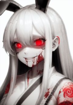 [(nsfw)::1],[[delicate fingers and hands:0.55]::0.85],(:cyan:0.6):1.12222,(:blue:0.9):1.11111,(black::0.5):1.13333[(black and white background:1.75)],(Transparent background:1.4),(black and white color scheme:1.65)(girl Focus:1.1),(beautiful detailed eyes:1.1),(beautiful detailed girl:1.2),[:outline:0.9],(solo:1.2),(blood on face:1.35)1girl,long hair,(kimono:1.2),(rabbit ears:1.2),Haughty expression,Rabbit species,Rabbit Tails,(Red Tattoo:1.4),(Glowing tattoos:1.4),(evil smile:1.4),Combat Stance,(Glowing red eyes:1.4),(Streams of light in the eyes:1.4)BREAK(Lycorisradiata:1.2),(contrasting colors:1.3),(only Character Coloring:1.4),(eyes_partially_colored:1.6),(gloomy:1.3)