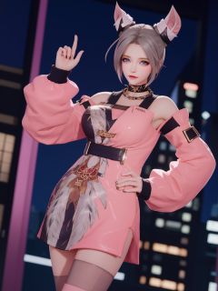 WZRYgongsunliWXXSG, 1girl, solo, blue eyes, looking at viewer, necklace,jewelry, choker, grey hair, short hair, pink dress,cityscape, night, mature female, hand on hip, striped thighhighs, <lora:WZRYgongsunliWXXSGi:0.75>,
