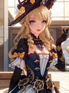 masterpiece, best quality, Navia \(genshin impact\), 1girl, hat, blue eyes, long hair, solo, dress, looking at viewer, blonde hair, witch hat, bangs, flower, drill hair, smile, hat flower, gold rudder shape decoration at the waist, dark red lipstick and eyeshadow,four-pointed star in eye ,long_hair