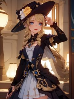 masterpiece, best quality, Navia \(genshin impact\), 1girl, hat, blue eyes, long hair, solo, dress, looking at viewer, blonde hair, witch hat, bangs, flower, drill hair, smile, hat flower, gold rudder shape decoration at the waist, dark red lipstick and eyeshadow,four-pointed star in eye ,long dress , hat feather