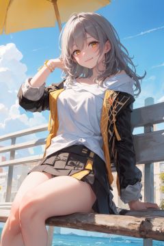 1girl,masterpiece, best quality,blue sky,yellow eyes,facing viewer,looking at viewer,smile,closed mouth,sitting on bench park,hand behind back