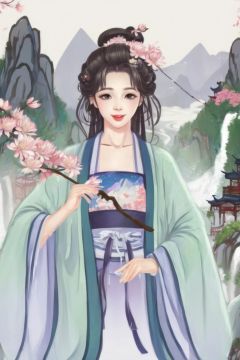 1girl, wavy hair, looking at viewer,holding a flower,upper body, floral print,ponytail, scenery,mountain waterfall, hanfu, chinese_painting