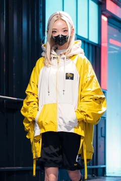 1girl, solo, gas mask, hoodie, longhair, en body, science fiction, closed mouth, yellow hair,pink clothes,tattoos in body,Technological background, parka, short pants, full shot,  human skin,Colorful portraits,Urban techwear,Outfit,Cyberworld,soft,nguang,newspaper, (movement:1.2),nijistyle, (white theme:1.2),flat