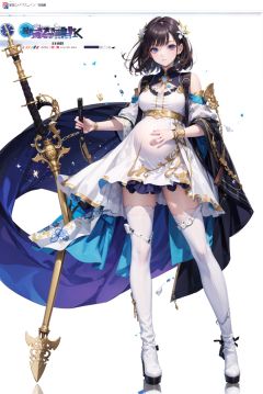 masterpiece, best quality,absurdres,full body,tachi-e,1girl,teenage,eye reflection,closed mouth,expressive hair,large breasts,narrow waist,(pregnant:0.9),short dress,white legwear,pantyhose,white pantyhose,knee boots,white boots,strap boots,standing,legs apart,high heel boots,thigh holster,drop shadow,weapon,holding weapon,,white background