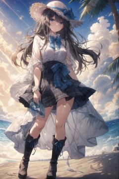 There is a chestnut hair with long waist and natural hair,  and the figure ratio is very good,  neither fat nor thin. The straight eyebrows just extend,  and the eyes are blue and deep,  as if a sea is concentrated, Women's shirt with lace flower bow tie,  a gray skirt over the knee,  a pair of long leather boots,  and a soft hat with fine plaid and black yarn hanging from the top, soft,  (seaside,  beach,  sunset,  horizon,  coconut tree), <lora:EMS-14220-EMS:1.200000>, , <lora:EMS-30426-EMS:1.000000>, , <lora:EMS-1495-EMS:0.300000>