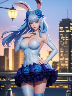 WZRYgongsunliHJW, 1girl, solo, flower, hair flower, long hair, blue eyes, rabbit ears,looking at viewer, blue hair, single thighhigh,  dress,detached sleeves, asymmetrical legwear,bangs, <lora:WZRYgongsunliHJW-000004:0.75>,cityscape, night, hand on hip, cowboy shot, mature female, clothing cutout,
