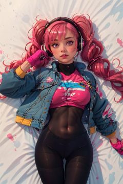 1Girl, bangs behind hands, tights, breasts, covering navel, crop jacket, gloves, headphones, impossible tights, jacket, big breasts, long hair, long sleeves, looking at audience, lying down, medium breasts, back, parted lips, pink tights, pink eye, pink hair, fluffy sleeves, red jacket, shrug\ (clothes\), skin tight, solo, twintails, Alice\ (nikke\), (masterpiece: 1.4), (best quality: 1.4), (shiny skin), realistic