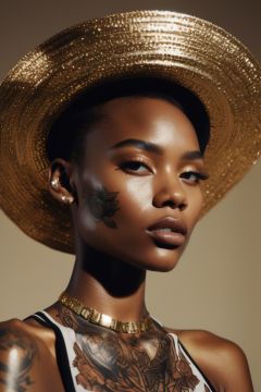 photograph, concept art, Adroit Enticing supermodel, (wearing intricately detailed isf:1.5) , (short messy hair) , (slim, toned, flat chest, small breasts) , Gold Cold hair, [Archean| Filipino] Hat, Afropunk, side lit, film grain, Kodak portra 400, Low shutter, extremely hyper aesthetic, art by Derek Gores, Nikon d850 film, hyper-realistic, real-life texture, dramatic, lighting, unreal engine, (facial clarity:1.5) , tattoo,