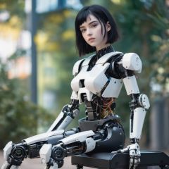 centered, upper body, masterpiece, | 1girl, solo, beautiful face, pale skin, (black hair), medium hair, full body, robotic legs, robotics arms, robotic body, robotic hands, futiristic, robotic, mechanical, armored, sitting, pure face, (black robotic body), mecha, | bokeh, depth of field, vaporwave colors scheme,