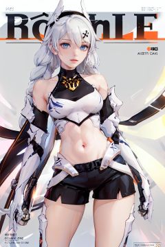 (yueguang, white armor,orange Light wings, winged hair ornament:1.2), blue eyes, wings,white cuish,white hair, blue eyes, braid, long hair, twin braids, bangs, bare shoulders