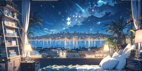 (masterpiece:1.2), best quality,PIXIV,cozy animation scenes,scenery, night, window, no humans, sky, plant, night sky, pillow, cityscape, bed, star (sky), book, chair, cloud, bookshelf, city, lamp, building, indoors, potted plant, starry sky, city lights, curtains, copyright name, artist name, skyscraper, shelf, bedroom, watermark, border <lora:cozy animation scenes_20230824111332:1>