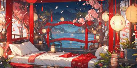 (masterpiece:1.2), best quality,PIXIV,cozy animation scenes,scenery, lantern, no humans, east asian architecture, architecture, tree, chinese text, petals, lattice, water, boat, watercraft, indoors, paper lantern, window, lamp,bedroom, <lora:cozy animation scenes_20230824111332-000018:1>