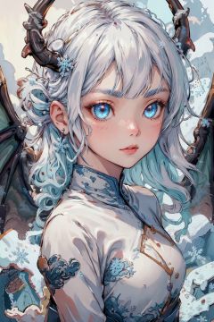 ((best quality)), ((masterpiece)), ((ultra-detailed)), extremely detailed CG, (illustration), ((detailed light)), (an extremely delicate and beautiful), a girl, solo, ((upper body,)), ((cute face)), expressionless, (beautiful detailed eyes), blue dragon eyes, (Vertical pupil:1.2), white hair, shiny hair, colored inner hair, (Dragonwings:1.4), [Armor_dress], blue wings, blue_hair ornament, ice adorns hair, [dragon horn], depth of field, [ice crystal], (snowflake), [loli], [[[[[Jokul]]]]],new_blue_b