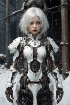 Masterpiece-level best_quality, concept artwork, a lonely solo girl, a necromancer character from the game "League of Legends", with snow-white hair, centipede-like tentacles wrapped around, blood flowing from the body, wearing PVC shell, mechanical exoskeleton device equipment, creating avant-garde and terrifying visual effect.