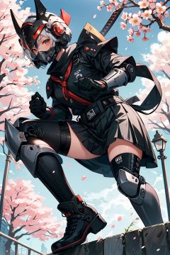 Masked knight build, mecha, samurai, samurai helmet, katana, slashing, power armor, exoskeleton, punk style, poster. Aspect ratio, battle flag, young girl, pink, JK-style skirt, black knee-high socks, cherry blossoms. The design has a modern punk vibe, featuring an exoskeleton, a headband, gloves, and a school uniform.