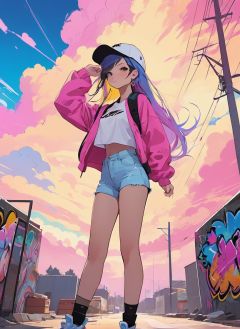 (official art, unity 8k wallpaper, ultra detailed, High quality, best quality), extremely detailed illustrition, (graffiti art), street style fashion, (Poladroid:0.8), cinematic angle, oblique sideways, (round image:1.1), [(pale yellow background:1.5): :5]//, rich colorful, (chromatic aberration), alternate color,\n(1girl:1.2), long messy hair, [pink light:2 | blue:1] hair, white fashion hat, midriff, balck hot pants, loose socks, earrings, full body,\n(colorful clouds:1.2), beautiful sky, detailed backgrounds, (colorful backgrounds:1.3),<lora:add_detail:1>