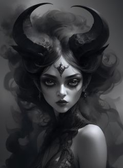 dark theme portrait of demon girl in the style of bastien lecouffe deharme, dreamy and ethereal, expressive pose, big black eyes, exciting expression, fantasy, intricate, elegant, dark and moody smoke, highly detailed, digital painting, concept art, smooth, sharp focus, illustration, black flowing ink, blackened eyes