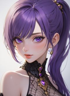 <lora:fiona:0.87> fiona, purple hair, lips, purple eyes, ponytail, bare shoulders, see-through, collarbone, masterpiece,best quality, Artstation, ultra detailed, photography ,cinematic, highres, original, (Hyper Realistic detailed eyes, detailed skin pores,),perfect lighting, delightful,intricate , attractive, revealing , appealing,hypermaximalist, elegant, Ornate,(cowboy shot),dynamic angle,(50mm Sigma f/1.4 ZEISS lens, F1.4, 1/800s, ISO 100, photograpy:1.2),Alluring, Flirtatious, Amative, <lora:add_detail:0.47:NF>,