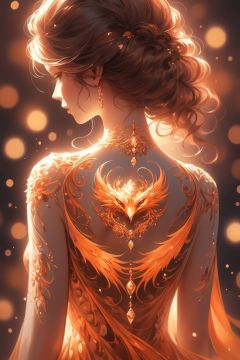 solo, long hair, profile, blurry, from behind, light particles, upper body, male focus, jewelry, depth of field, earrings, 1boy, back, facing away, 1girl, brown hair, bokeh, eyelashes, black hair, floating hair, back tattoo, blurry background,11,Spirit Fox Pendant,phoenix pendant