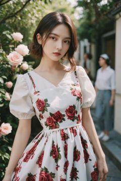 cinematic photo analog film photo, Dolce & Gabbana rose-printed cotton-poplin dress, Olympus PEN-F with M.Zuiko 17mm f/1.8, design by Carolina Herrera (卡罗琳娜·赫雷拉) . 35mm photograph, film, bokeh, professional, 4k, highly detailed