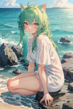 light green hair, messy hair, long hair, (Detailed eyes description), :3, yellow eyes, cute,