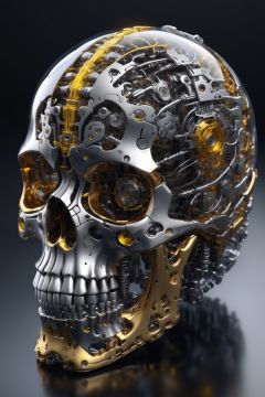 figure of biomechanical cyborg skull made of glass, transparent, see-through intricated interal mechanical metal part, metal array, hi-tech, sci-fi, difficult, chip, circuit, post-production, elegan, black and yellow, shadow:0.3, high_res,cyborg style