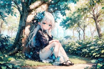 (masterpiece, best quality, illustration, official art:1.05), (tachi-e:1.12), full body, sitting, looking at viewer, solo, 1girl, elf girl, long hair, redhair, /+\+/+\+/+\+/+\+, [green|blue] eyes, dress, white hair flower, hair ornament, (age8), (child), wind, leaf, tree, forest, kid, <lora:EMS-14220-EMS:1.300000>, , <lora:EMS-30781-EMS:0.700000>