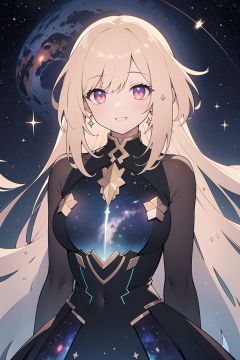 1girl,in space,cosmic beauty,cosmic dress,stars,nebula,glowing body,glowing eyes,flying hair,visually  stunning,beautiful, smiling,