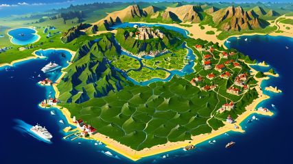 Magical world, scenery, water, outdoors, trees, no one, boats, maps, beaches, roads, sand, sky, sea, buildings, boats, islands <lora:sdxl_ditu:1>
