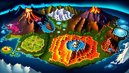 Magic world map, volcano, glacier, swamp, storm, desert, Pirate island, deep forest, abyss, Sky City <lora:sdxl_ditu:1>