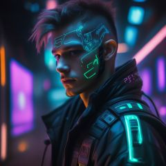 close-up, maximum detail, science fiction, distant future, cyberpunk, a man, 22 years old,wearing a cyberpunk outfit, led lights, neon, screens with alien symbols,Movie Still,NightmareFlame