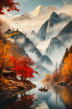 <lora:1.5:0.9>,shan,watercraft,boat,bird,tree,scenery,water,lake,mountain,outdoors,reflection,nature,river,<lora:民族:0.6>,1girl,