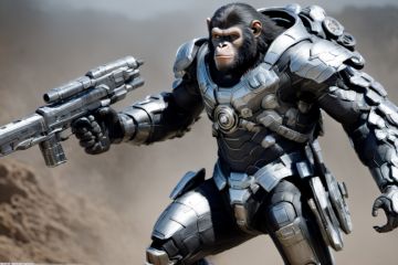 ultra realistic,(masterpiece, best quality), planet of the apes, sci-fi chimpanze mecha soldier characters escorting spider seige ****, aiming railguns, swinging power hammer, Matte white armor with candy red illuminated trim, dragon ball z scouter, salat helmet, Mass Effect N7 Armor, human skulls on belt and back, wrist mounted blades, wrist mounted alien gun, glowing power cells and coils, anthropomorphic figure, intricate details, detailed glowing amber eyes, various fur types, lifelike fur, wearing round bulky futuristic armor with glowing details, mechanical, faces high attention to detail, nice large flat surfaces of armor, interlocking armor peices, charging pose on all four limbs, jetpacks, exo suits, Hydralic tubes on armor, energy grenade on belt and various tools, reflection mapping, realistic figure, Large mecha gun with drum mag, hyperdetailed, cinematic lighting photography, landscape jungle alien planet with futuristic industrial mining equipment,tree houses, moab rocks scttered, highly detailed faces of all characters in scene, dslr, 8k, 4k, ultrarealistic, realistic, natural skin, textured skin,Movie Still,cyborg style,mecha