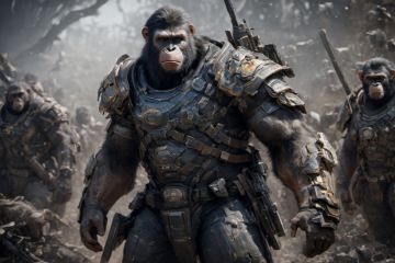 4K, 8K, masterpiece, best quality, insanely realistic, life like photo, genji armor, YAKEDA Full Protection Tactical **** Top, bomb suit, flak jacket, ripped and weathered tan to brown cloak, matte black teal armor and neon orange and sparkling galaxy pattern, holding glowing lightning sword, sci-fi elven open faced helmet, full body armor, weapon master, sword in hand, sword neon glow, neon wrist weapons, bulky weathered space marine armor, perfect eyes, vengeful amber eyes, insanely detailed eyes, hyper realistic eyes, glassy eyes, 4k eyes, sci fi daggers on body, leader sword in hand, leader pistol in hand, leader shotgun, grenades, ultra detailed, long shot cinematic image of a group of apes with glowing spears the leader is waling through a crowd of apes glowing sword in hand in a lush sci fi jungle outpost city, hi-tech jungle city, flak armor, full body armor, super ripped chimps, huge muscles, neck protection armor, astronaut helmet on chimps, chimp with translucent visored helmet, sci fi helmets, tan weathered and ripped cloaks, cyberpunk armor, enforcer armor, full sci-fi plate armor, bandoliers, chimps throwing grenades, chimp raising fist, super muscular chimps, artificially enhanced chimps, intricately detailed guns, hyper detailed guns, intricately detailed weapon detail, guns shouldered, all faces hyper realistic, first two rows faces hyper realistic, Sci fi guns, grumpy gorilla, leader weapon in hand, warrior, warrior armor, leader weathered red matter power suit armor, leader bulky armor, leader detailed eyes, hyper detailed eyes, Extremely detailed face, movie quality face, with a gun, sci-fi armor, cyborg armor, Extremely detailed armor, cyberpunk gasmask, armor glowing trim, helmets, radiance, attack stance, combat stance, rifle, raised, pistol raised, random expression, Congo-apes, Billy ape, helmets with face, flak_jackets, juggernaut armor, enforcer, torches in hand, torches, cinematic fire, chest armor, chest armor, shin_ armor, red and white loincloth with pattern, battle belts, tools on belt, bandolier, modern body armor, tech gauntlet, wrist armor, weapons, weapons in hand, weapons on back, the end of humanity, hammers, perfect faces, interesting expressions, natural skin, textured skin, hyper detailed faces, Extremely detailed faces, pores, Extremely detailed weapons, Extremely detailed bodies, planet of the apes, HIGH resolution, SUPER resolution, HYPER resolution, HD resolution, BEAUTIFUL, neon signs, Extremely detailed fur, photorealistic fur