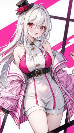 masterpiece,best quality,official art,1girl,cold face,best quality,long (white hair),(mini top hat),detailed red eyes,hair between eyes,braid,french braidoff-shoulder dress,white background,arm grab,(Raspberry Pink lips:1.4),romper,genderswap \(ftm\),nib pen \(medium\),BREAK Design a color-blocked scene, with bold, contrasting hues, strong shapes, and a sense of dynamic energy,,fujifilm xf 90mm,dutch angle,sulking,lens flare,crosswalk