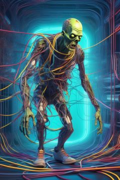 zombie man connected to cyberspace, wires, cables, tubes, complex, surreal, futuristic, three fourth perspective, high tech, line art, (flat colors), masterpiece, high quality, 8k, best quality,