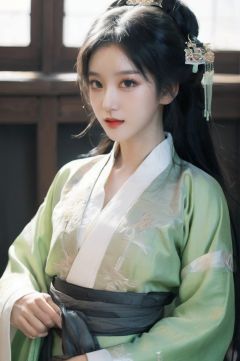 leogirl, cute 1girl, messy long black hair, lip biting, seductive leaning forward, detailed skin, detailed face, cleavage, realistic, photorealistic, ((full body:1.4)), (studio light:1.2), Artgerm, evil smile, choker, ((hanfu, chinese clothes, long skirt, light green robe)), shoes, traditional architecture,((hair ornaments)),