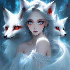 (masterpiece,best quality,niji style),sexy lady, bare shoulder,big eyes, fox, light blue backgroud,blood, ghosts,3d real