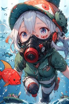 (Masterpiece), (masterpiece), (extreme light and shadow), (exquisite facial features), (extreme details), strange fish mutated in the environment of nuclear radiation, polluted ocean, a girl, running in fear, gas mask,