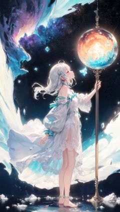 (((green, silver, glimmer)), limited palette, contrast, phenomenal aesthetic, best quality, sumptuous artwork,(masterpiece), (best quality), (ultra-detailed),(((illustration))), ((an extremely delicate and beautiful)),(detailed light),1girl,cold theme, broken glass, broken wall,((an array of stars)),((starry sky)),the Milky Way,star,Reflecting the starry water surface,(1girl:1.3)aqua theme,white hair,blinking,white dress,closed mouth,constel lation,flat color,noline art,full Glass sphere,girl inside glass sphere,white hair,braid,blinking,white robe,bust \(sculpture\),barefoot,float,closed mouth,constel lation,flat color,holding,holding wand,looking up,standing,male focus,medium hair,standing,solo,space,universe,utaite(singer),Nebula,many stars,