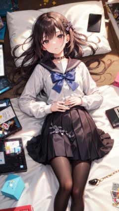 ((masterpiece)),(((best quality))),(ultra-detailed),(best illustration),(best illumination, best shadow),((an extremely delicate and beautiful)),dynamic angle,floating,(Short focal length)(Long object distance)(back depth of field),chowbie_jue,bangs,black_bow,black_pantyhose,black_skirt,blurry,blurry_background,bow,braid,brown_eyes,grey_hair,hair_between_eyes,hair_bow,hand_up,highres,legs,long_hair,long_sleeves,looking_at_viewer,original,black background,pantyhose,pleated_skirt,puffy_long_sleeves,puffy_sleeves,sailor_collar,shirt,skirt,solo,standing,white_sailor_collar,white_shirt,solo,messy room,loaded interior,bedroom,(((otaku room))),(computer)wide shot,(lying on back:1.3), Herb Ritts,cowboy shot,fisheye