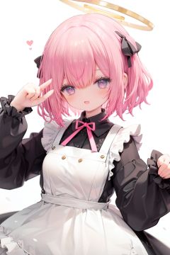 1girl, solo, apron, halo, hair over one eye, closed eyes, smile, white background, dress, white apron, simple background, long sleeves, multicolored hair, braid, open mouth, blue hair, alternate costume, blush, bangs, :d, pink hair, black dress, ribbon, frilled dress, enmaided, short hair, hand up, colored inner hair