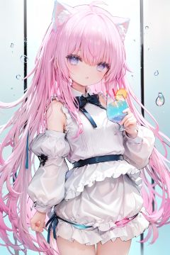 cowboy shot, masterpiece,Splash color, soft lighting,(cocktail glass), 1girl, solo, cat ears, multicolored hair, ((gradient hair), white+(blue)+(pink:0.5) hair//), very long hair, messy hair, bangs, ahoge, ((gradient eyes), pink+light_blue eyes//), slit pupils, glowing eyes, 1fang, white sweater