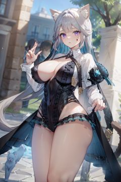 (8k, best quality, masterpiece), (ultra-detailed:1.1), (high detailed skin),1girl,shadow,outdoors, crowd, france, <lora:littlefat-sd-v100-000012:0.75>,littlefat,<lora:lnt-v2-v100:0.85:char>,lnt, 1girl, purple eyes,long hair,(star facial mark:1.2), cat ears, tail, grey hair, bangs,[[delicate fingers and hands:0.55]::0.85], (detail fingers), (one hand with no more than 5 fingers),(beautiful_face), ((intricate_detail)), (revealing clothes:1.2),((finely_detailed)), fine_fabric_emphasis,((glossy)),