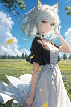 kaldef,casual dress,green eyes,1girl,masterpiece, best quality,hair blowing,looking at viewer,blue sky,meadow,tree,leaf,white hair