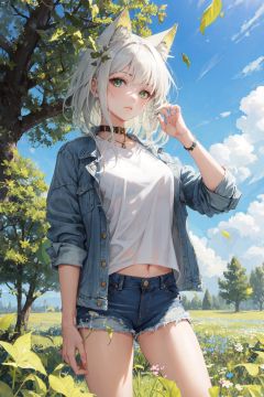 shirt,denim_shorts,green eyes,1girl,masterpiece, best quality,looking at viewer,blue sky,meadow,tree,leaf,white hair,denim jacket,facing viewer