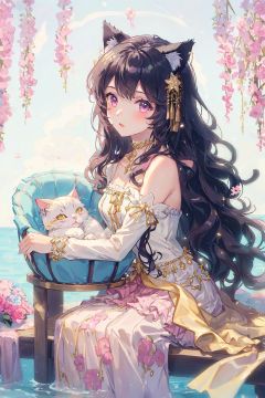 1girl, wearing a white tulle skirt with golden tassels, exquisite face, gold jewelry, gold decoration, black wavy hair, a pair of cat ears that can control water around her, dazzling and colorful, extremely cute, sitting in a cradle full of flowers,Pink Mecha