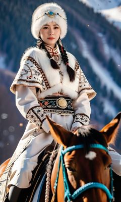 oriental fantasy,1girl,wearing a zangfu clothes,big breast,super cute,riding a horse,horseback riding,strong horse,winter,outdoors,white coat,((masterpiece)),((best quality)),8k,high detailed,ultra-detailed,