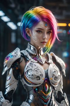 surreal photography of a stunning beautiful cyborg female, rainbow hair, huge breast, (beauty and detailed armor), embraced, delicate white filigree, intricate filigree, glowing, navel, highly detailed, intricate detailed, face symmetry, masterpiece, award-winning, sharp focus, concept art, low key, 8k, uhd, low key, octane render